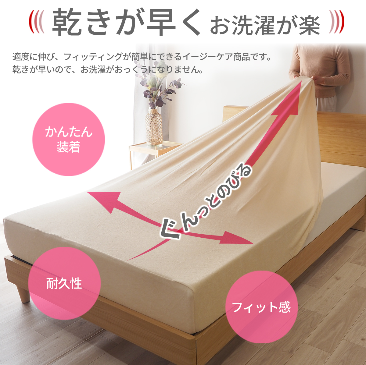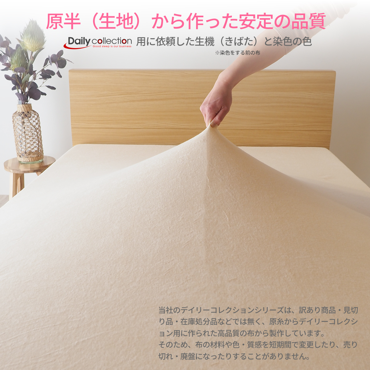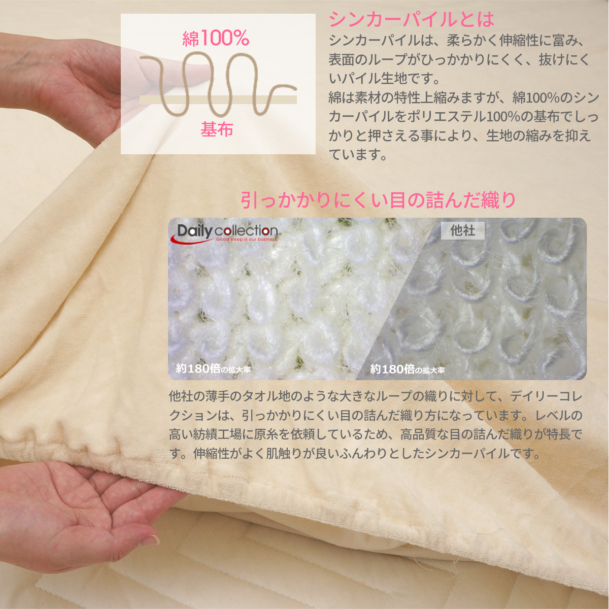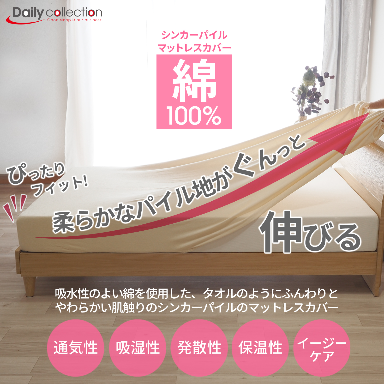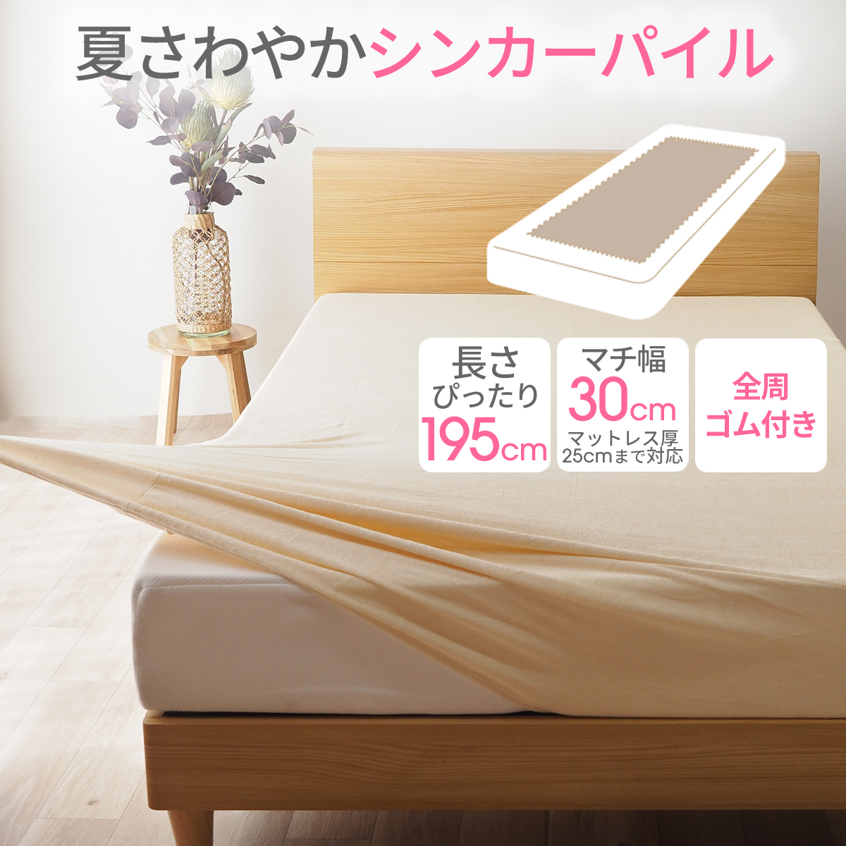 このマットレスカバーは、柔らかいシンカーパイル生地で作られており、綿100%の心地よさを提供します。伸びるパイル生地が特徴で、ぴったりフィットするので、シワになりにくく、よれにくいのが嬉しいポイントです。ゴム留めタイプで、クリーム色がどんなインテリアにもマッチし、ベッドメイキングが簡単に!お手入れも楽々です。