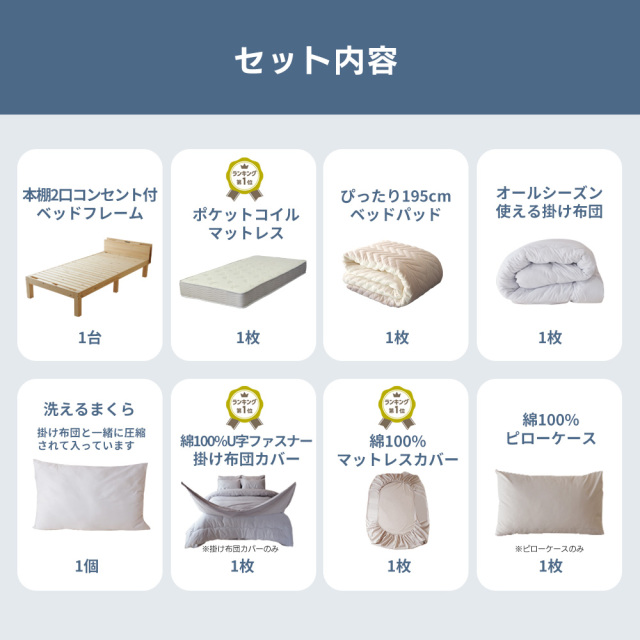 新生活に必要なベッドまわりがすべて揃う! 届いたその日から快適ベッド♪ 子育て世代のスタッフが母目線でコストと品質を考え厳選した 新生活8点セットです! <<<セット内容>>> ■木製ベッドフレーム ■ポケットコイルマットレス ■寝装品 【マットレスカバー】 【ベッドパッド】 【掛け布団カバー】 【ピローケース】 【まくら】 【掛け布団】