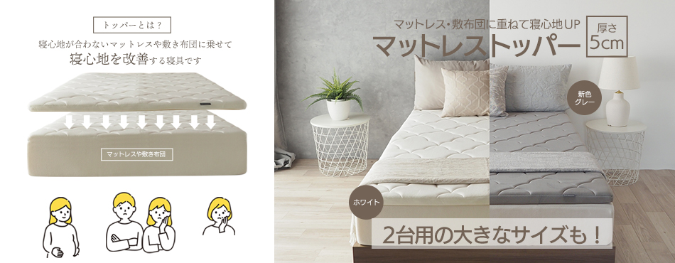 トッパーとは、マットレスの上に載せて寝心地を良くするオーバーマットレスです。マットレスを買い替えせずに寝心地をアップすることができるので、近年人気急上昇中です。 |