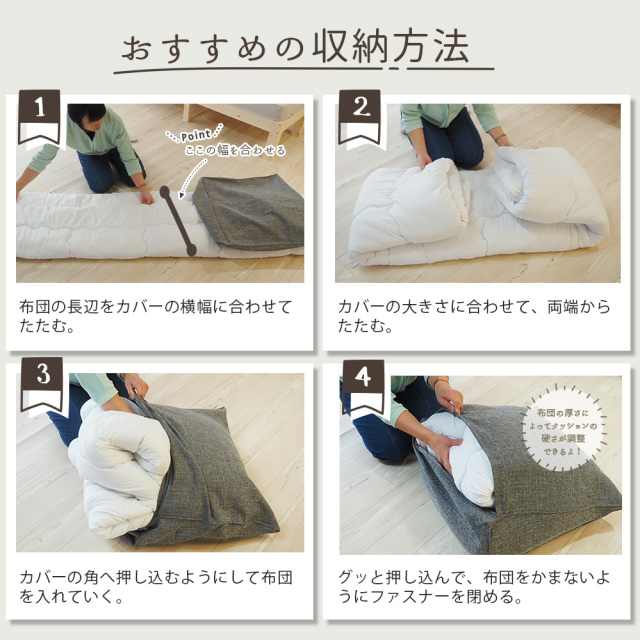 布団をすっきり収納しながら、快適なクッションとしても活用できる「クッションになるふとん収納ケース」。この商品は、布団を収納するだけでなく、背もたれや三角クッションとしても使える多機能なカバーです。幅60cmのサイズで、ソファやベッドサイドにぴったりフィット。シンプルでスタイリッシュなデザインが、どんなインテリアにも自然に溶け込みます。寛大なクッションカバーで、リビングや寝室をより快適な空間に変えましょう。