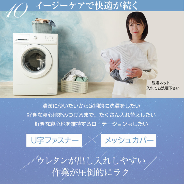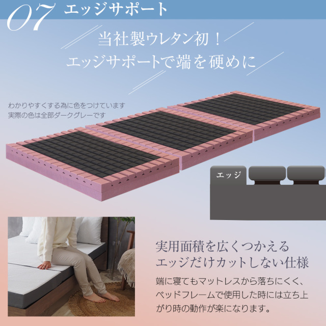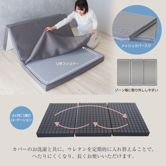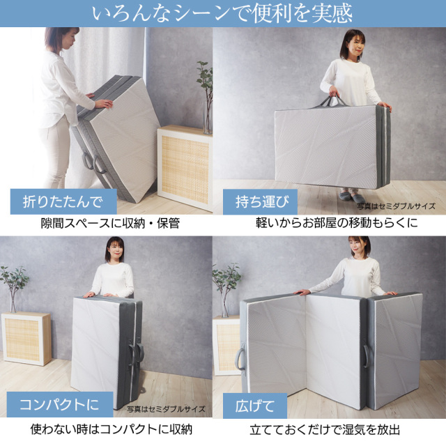 ウレタン素材の3Dセル構造により、体圧を均等に分散し、一晩中快適な睡眠をサポートします。 85スモールシングル、シングル、セミダブル、ダブルの各サイズをご用意しており、お部屋のスペースに合わせて選べるのも魅力の一つです。また、三つ折りが可能なため、収納時に場所を取らず、使いたい時にサッと広げることができます。アウトドアやキャンプ、車中泊など、さまざまなシーンでの使用にも最適です。