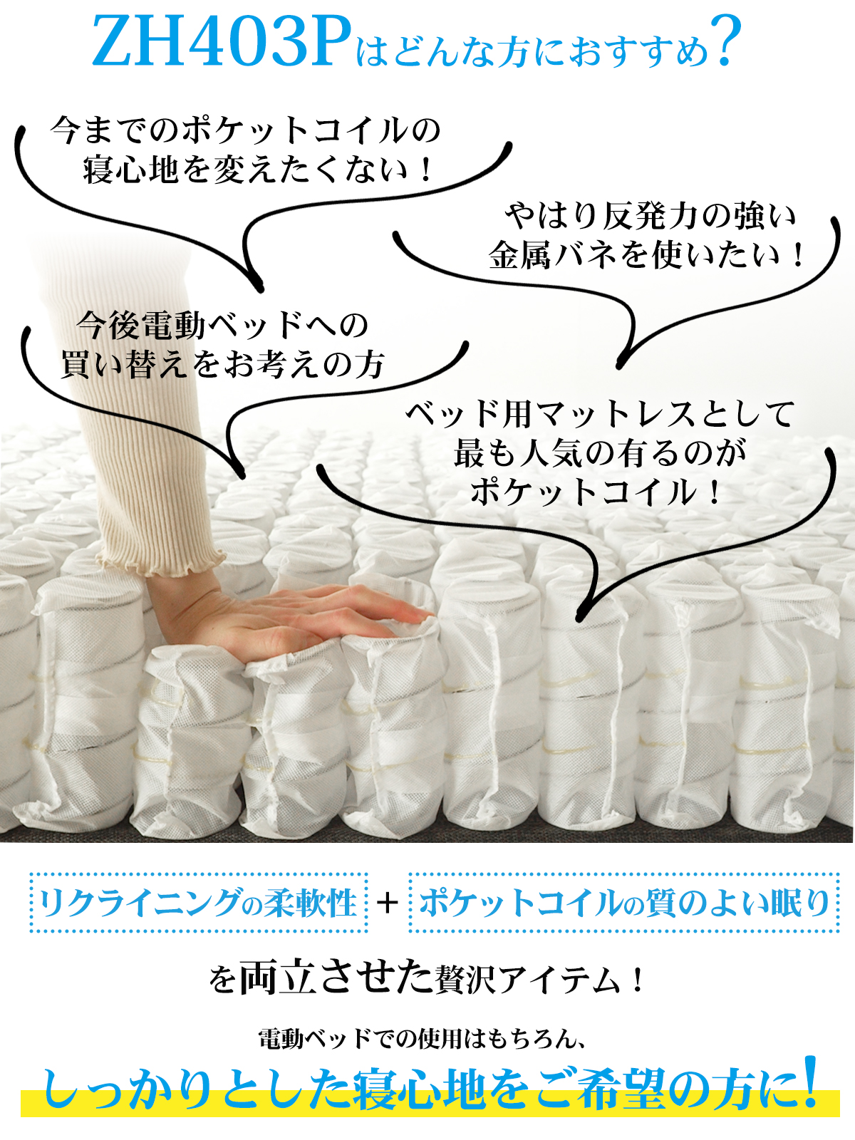| 製品名: | 電動ベッド対応 ポケットコイル マットレスのみ シングル セミダブル ダブル ZH403P 線径2.1mm 厚み20cm 体に沿う リクライニングに沿う |