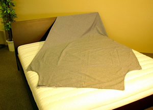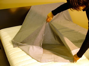 実は形的には日本の氷嚢(ひょうのう)のような形態で、氷嚢の氷を入れる部分から掛け布団を入れるのです。入口が狭い為、安定しますし、入口の所をそのまま垂らしても良し、マットレスの下に織り込んでもいいという使い方です。