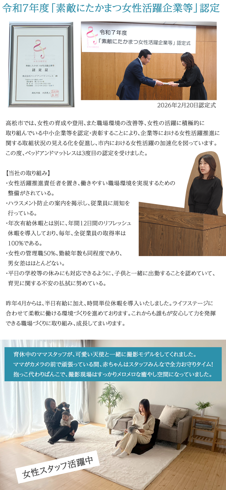 ★2026年2月20日 高松市から「素敵にたかまつ女性活躍企業」認定証をいただきました。