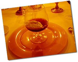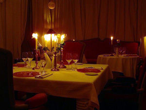 テーブルウエアはゴージャスで天井のシャンデリアのろうそくの火が揺れている空間です。