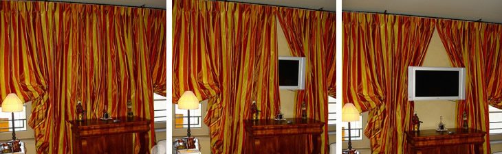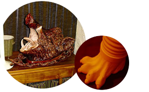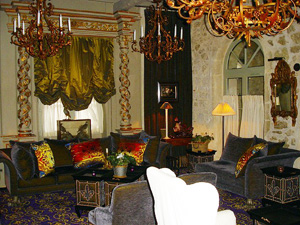 ダイニングテーブルの脚はライオンの脚のようなデザイン、壁には4mおきぐらいにろうそくをつかんだ腕がヌッと出ているわけです。