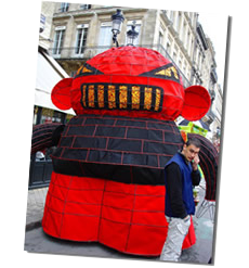 ピエロが反り返って喜び、もう一人のピエロは腹を抱えて道路に転げてまわり大笑い。(左写真)
